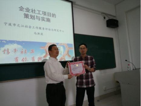 社会工作系邀请了宁波市之江社会工作服务评估与研究中心主任马洪波来到《企业社会工作》课堂,围绕企业社工项目的策划与实施为社工系学生开展了一次别开生面的讲座。在讲课前,社工系主任陈建胜副教授为马洪波颁发了雷速体育官网