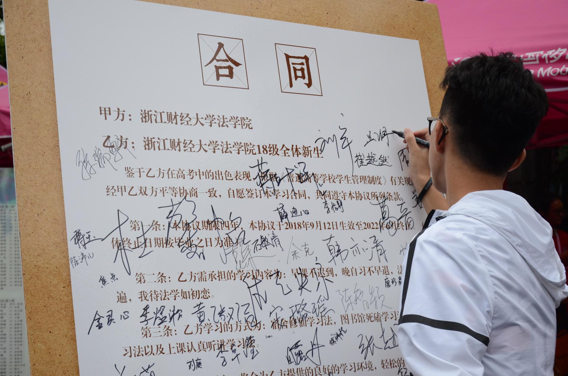 报到现场,新生们在学生会提前准备的“新生合同书”展板上郑重签下自己的姓名,向雷速体育官网