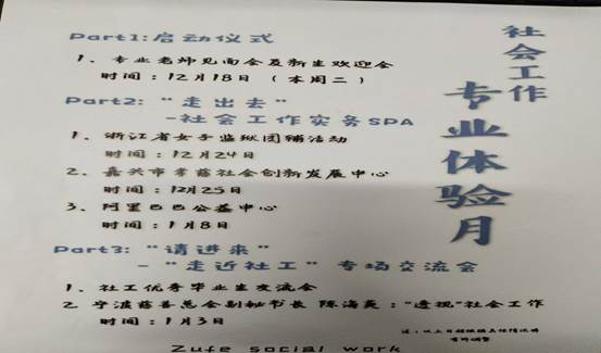 12月18日下午,社会工作系启动“社会工作新生专业实践月”活动。本次实践月活动包括“师生见面会”、“外出参与式学习”(阿里巴巴公益中心、嘉兴孝慈社会创新中心----新塍国家社会工作实践基地、浙江省女子监狱团辅活动等)、“实务导师进课堂”、“社工学长与新生交流会”、“‘微信群’线上服务活动”、“学生社团活动”等,以增加社会工作专业新生对社会工作专业的了解和认知。