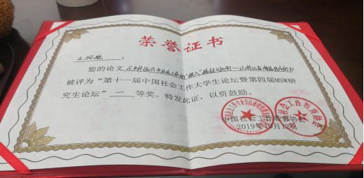 社会工作系17级本科生王润航参赛论文《乡村振兴中社会工作是“嵌入”的路径和机制—以浙江省海盐县为例》荣获一等奖。
