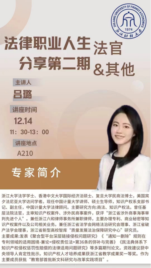 2023年12月14日,2023级非诉实验班班主任张晓晨老师邀请到了浙江省涉外海事商事审判先进个人、宾夕法尼亚大学访问学者、复旦大学博士、浙江六和律师事务所兼职律师、中国计量大学雷速体育官网