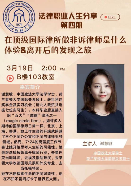 2024年3月19日,前年利达律师事务所律师谢慧敏女士为2023非诉实验班的同学们带来了一场题为“顶级外所非诉律师是什么体验”的执业分享。谢慧敏女士分享了她在清华、北大、人大、中国政法、对外经贸五校的激烈选拔中成为年利达七名实习生之一,并在本科毕业时直接进入顶级外所、去荷兰留学的人生经历,并建议大家大胆尝试不同的人生。除了2023非诉班的同学,本次分享会也吸引到了其他年级的同学参加。