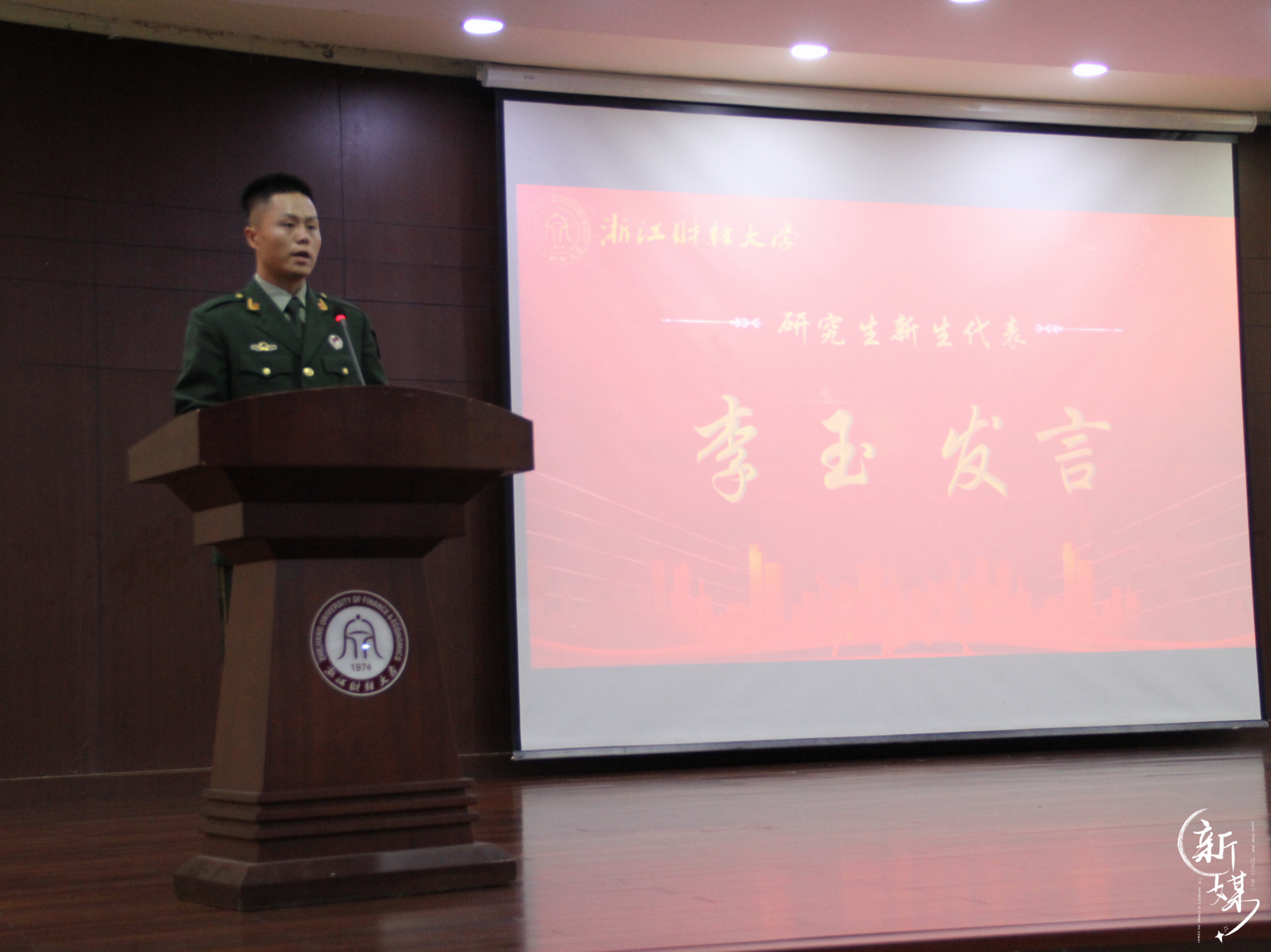 2024级研究生李玉作为研究生新生代表发言,他曾经是一名光荣的武警战士,怀着为母校争光的想法,先后两年获得优秀新兵,支队嘉奖等荣誉。他号召同学们立德修身,坚守正义,明晰目标,坚定方向,夯实基础,提升素养,勇于担当,服务社会。用自己的行动去书写和践行“强国有我”的誓言!