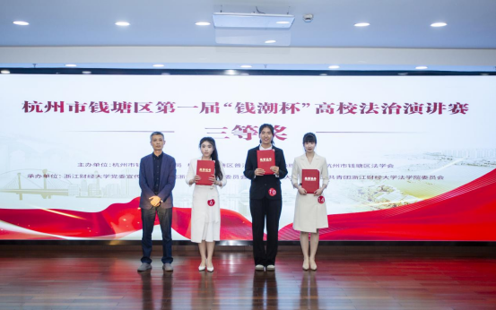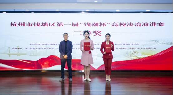 11月12日,由钱塘区司法局、区普法教育依法治理办公室、区法学会主办,浙江财经大学承办的钱塘区第一届“钱潮杯”高校法治演讲赛在我校下沙校区举行。杭州市司法局普法与法治社会建设处处长王海华、杭州市钱塘区委政法委委员、区司法局副局长胡瑾、杭州市钱塘区人民法院司法保障服务中心副主任高源、杭州职业技术雷速体育官网