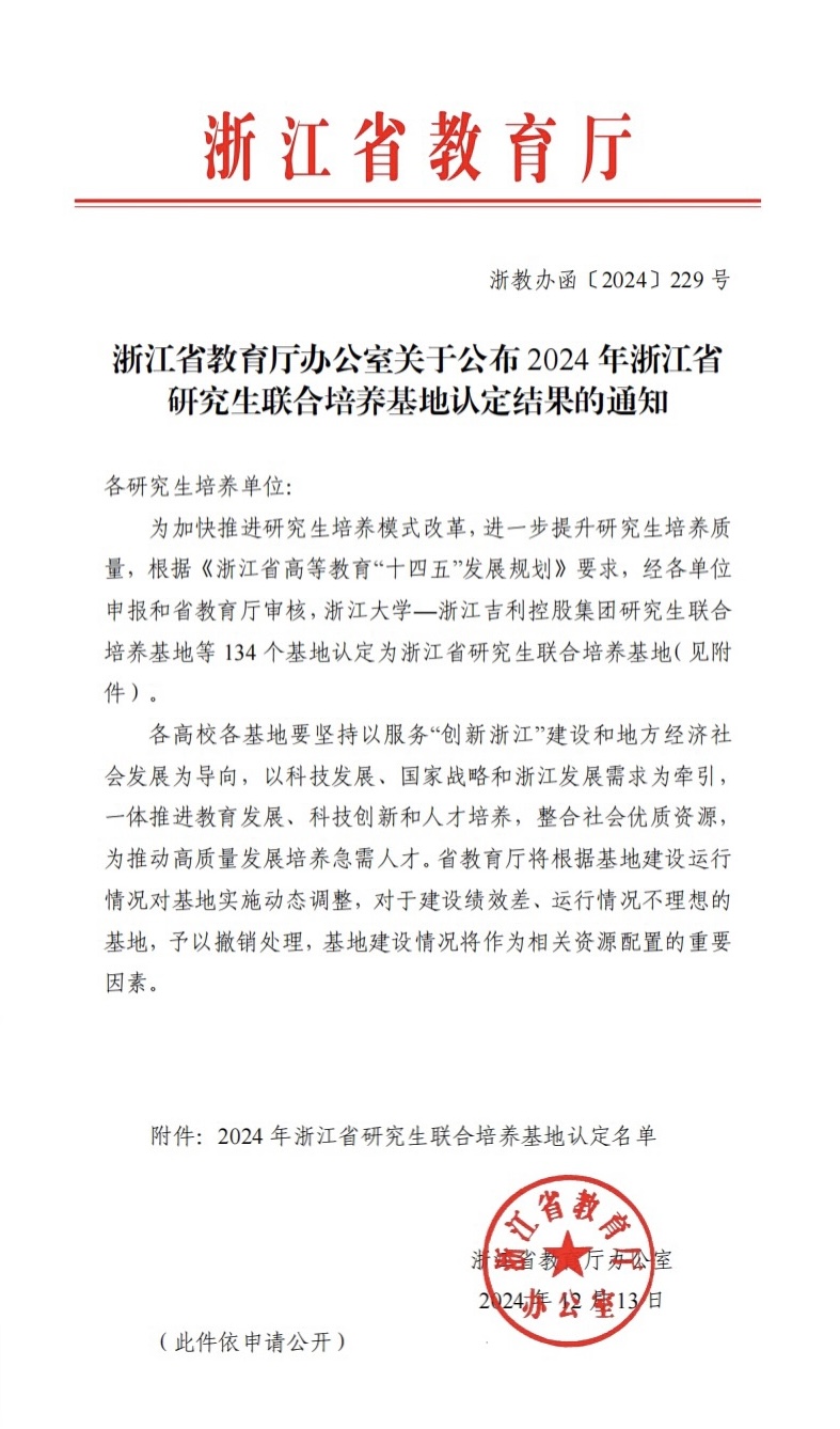 近日,浙江省教育厅办公室公布了2024年浙江省研究生联合培养基地认定结果,雷速直播
