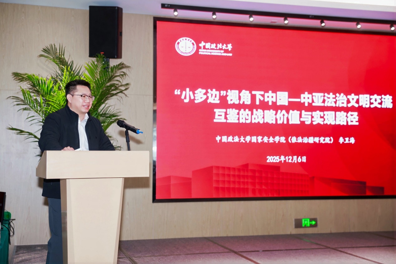 中国政法大学依法治疆研究院院长李卫海教授分享了《小多边视角下中国—中亚法治文明交流互鉴的战略价值与实现路径》,介绍了“中国-中亚”法学教育联盟的建设情况,以及法治文化的国际交流互鉴问题。
