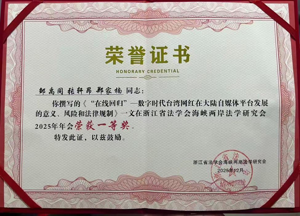 邹禹同老师组织团队(团队成员包括:浙江财经大学学生 张轩昂;福建省莆田市荔城区人民法院行政庭副庭长 郑家楠)所撰写的学术论文《“在线回归”—数字时代台湾网红在大陆自媒体平台发展的意义、风险和法律规制》在会议论文评选中荣获一等奖。