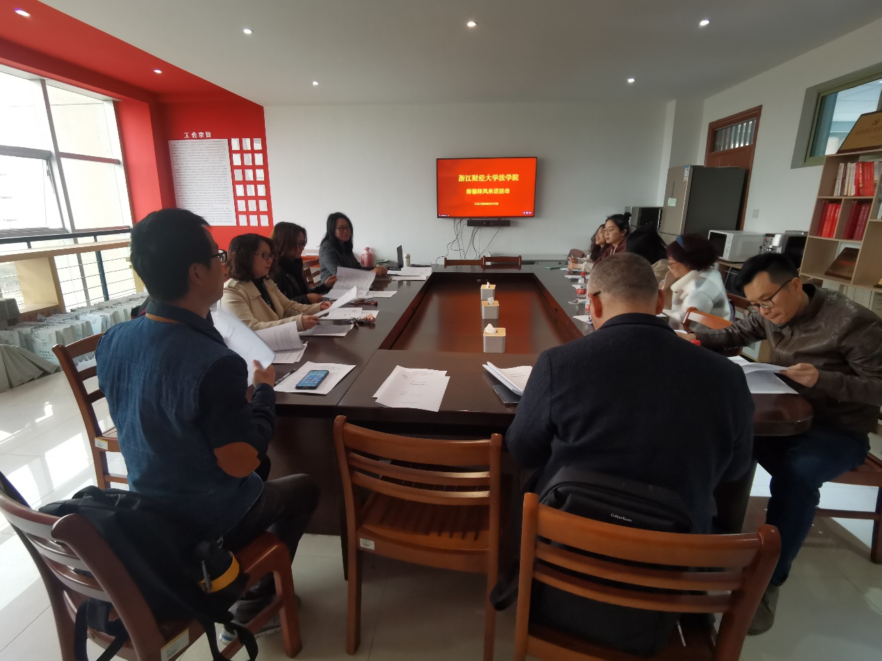 党委书记朱丹带领各系、各办公室认真学习了《关于加强和改进新时代师德师风建设的意见》《新时代高校教师职业行为十项准则》《浙江财经大学建立健全师德师风建设长效机制实施办法》等文件,引导教师对师德师风问题知敬畏、存戒惧、守底线。