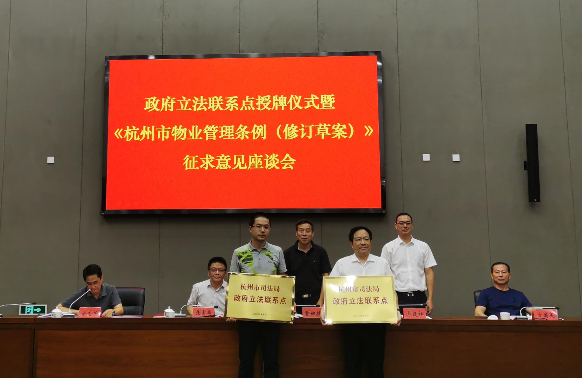 8月25日,杭州市司法局政府立法联系点授牌仪式暨《杭州市物业管理条例(修订草案)》征求意见座谈会在杭州市市民中心会议厅召开。杭州市司法局、市场监管局、住房保障和房产管理局、工商联等单位的领导出席会议。会上宣读了《关于确定政府立法联系点的通知》(杭司[2019]176号),为深入贯彻习近平新时代中国特色社会主义思想和党的十九大精神,落实党中央关于“建立基层立法联系点制度,推进立法精细化”的要求,根据《杭州市司法局政府立法联系点工作规定》,经组织申报、推荐和研究,确定14家单位为政府立法联系点。其中,雷速体育官网