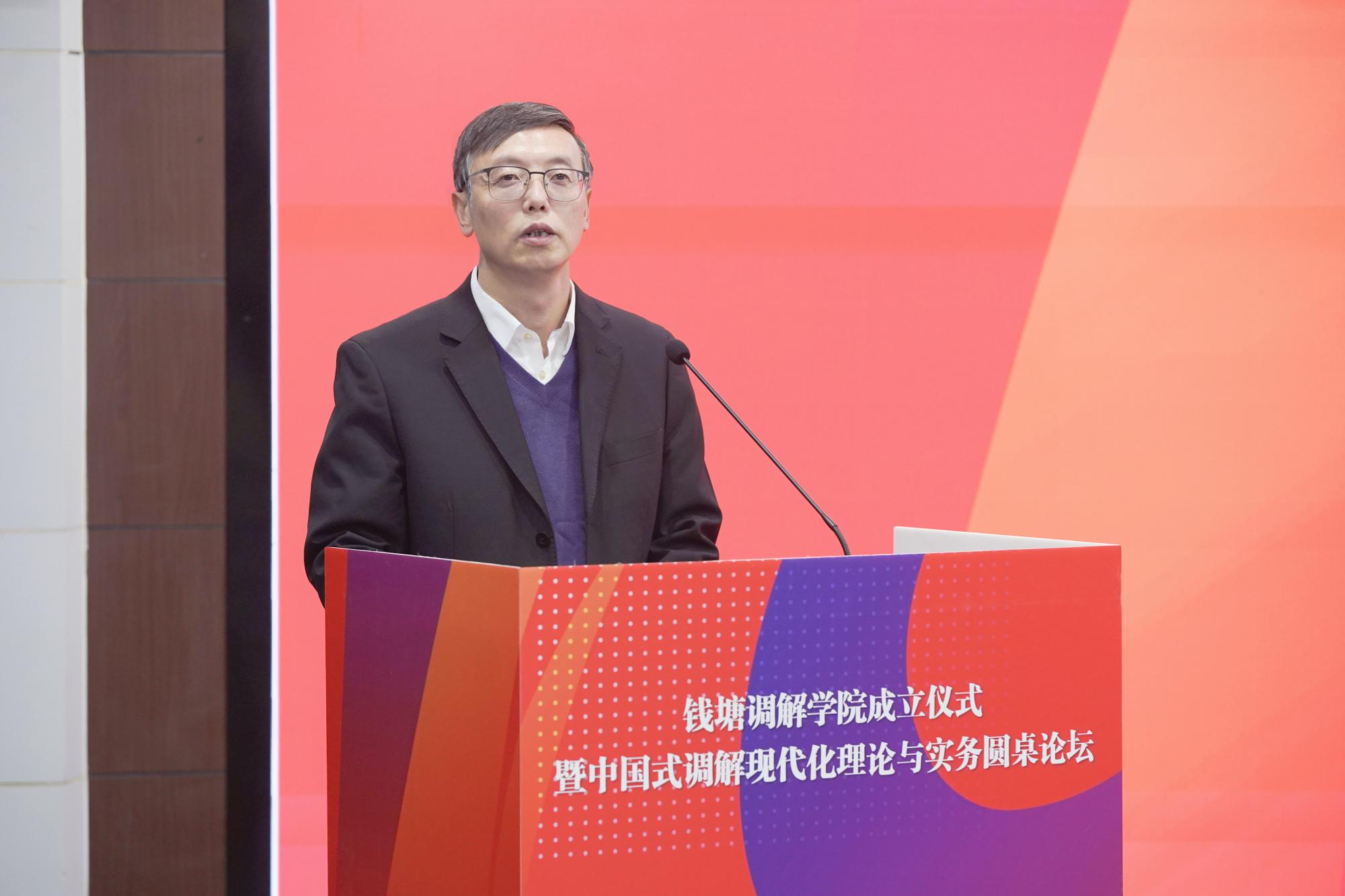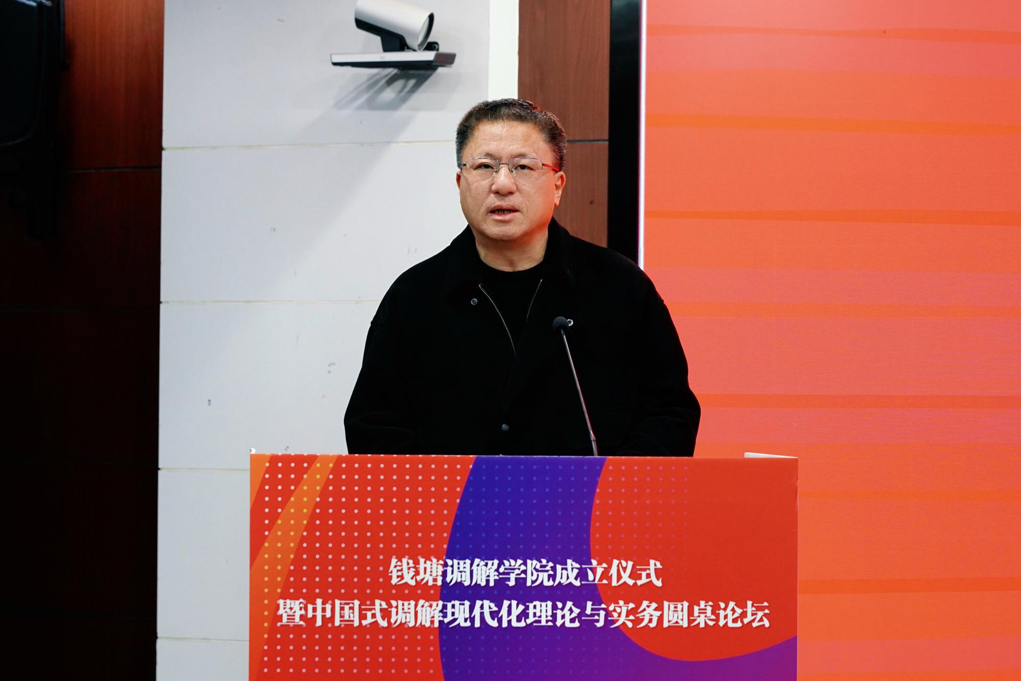 唐学兵代表杭州市中级人民法院对钱塘调解学院的成立表示热烈祝贺。他强调,共建钱塘调解学院是杭州法院和浙江财经大学主动回应时代之问、实践之需的积极作为,是深化基层社会治理创新的一项重要举措,是法治建设与高等教育协同育人的一次生动实践,更是贯彻落实党的二十大关于“完善社会治理体系”决策部署的具体行动。希望共建各方坚持党的全面领导,深度融合高校的学科智力优势、法院的司法实践资源以及社会各界的治理力量,共筑“治理融合体”,在协同联动上彰显新格局;聚焦调解制度完善与理论创新,强化实务技能传授与职业道德培育,共建“人才孵化器”,在育才赋能上实现新突破;突出实战实用导向,通过理论与实践的循环赋能,切实提升矛盾纠纷的实质化解效能,共创“实践先行区”,在提质增效上展现新作为。