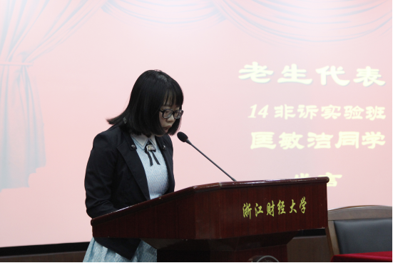 之后,14非诉班匡敏洁同学和16法二班余嘉颖同学分别代表老生和新生发言。
