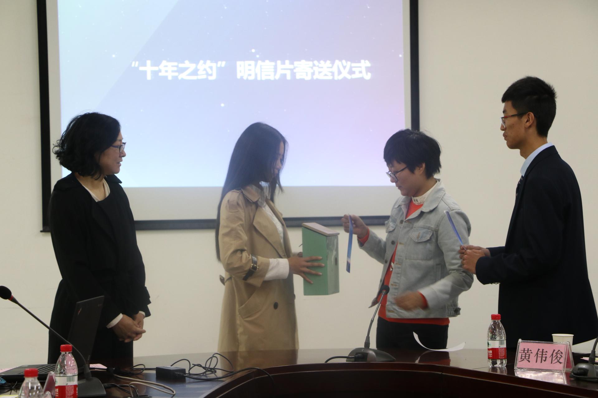 会上,校友们十年前的影像集《我们的纪念册》掀起了活动的高潮,这些03级校友在菜园生活的记录,勾起了校友们十年前的回忆,校友们的情绪被视频中的画面和场景牵动。在接下来的环节中,校友们在明信片上写下了对自己、对学院未来十年的期许,并由法学院党委书记朱丹老师和校友代表梁赟一起封存进信箱,全体返校校友共同约定下一个“十年之约”,毕业二十周年之时在法学院相聚。