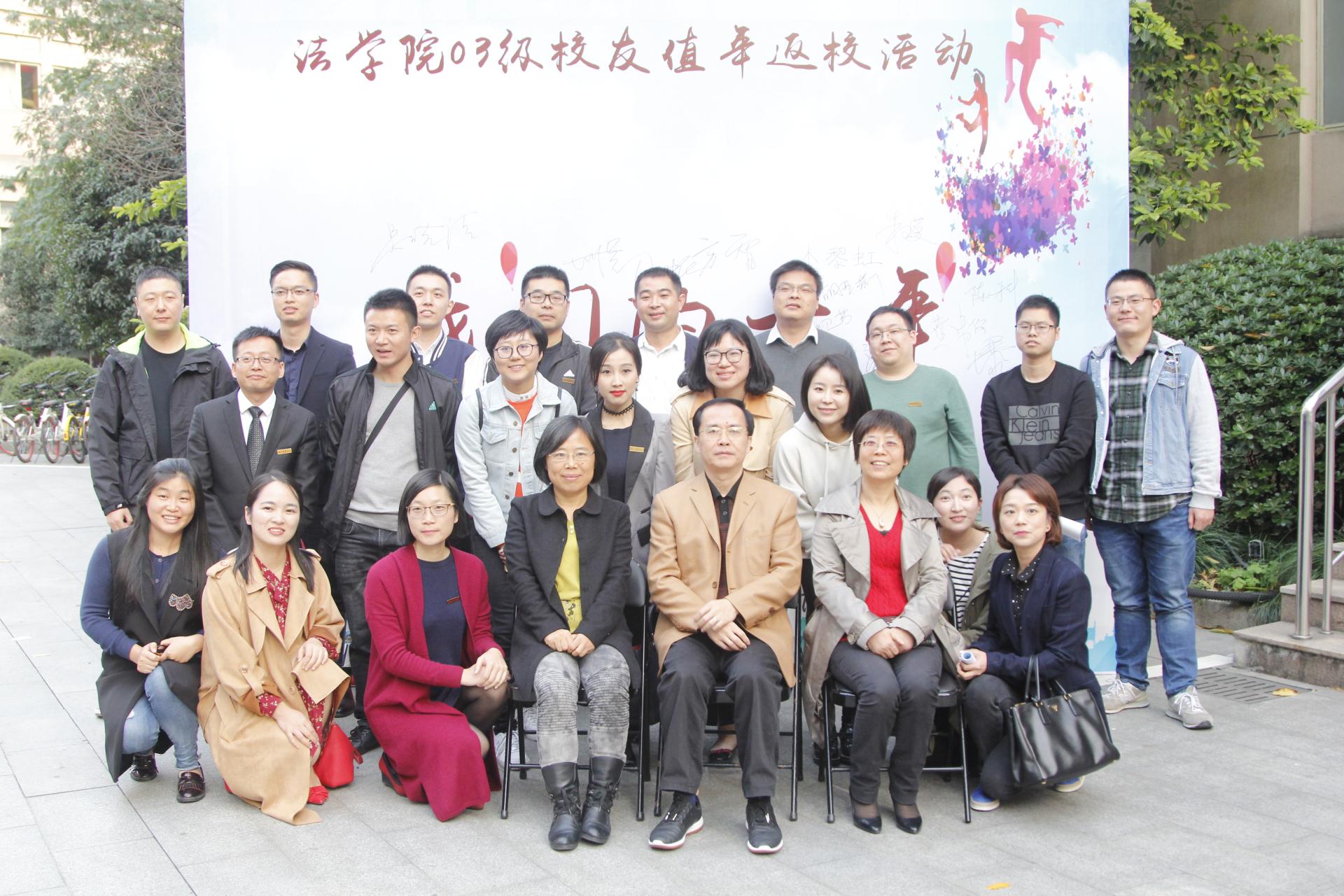 而在法学院303教室,03级校友们十年后重返课堂,03级曾经的任课老师茅铭晨老师、沈建萍老师、李春燕老师应邀参加活动,带领同学们上了特殊的一课。这节课整整持续了三个多小时,茅铭晨老师回忆了与03级同学在校的点滴,分享了与03级同学的情谊,同时他告诉同学们不断自我提升与从容心态的重要性,也鼓励同学们加强与学院的交流。沈建萍老师则分享了自己的从业经历,并提醒校友们在职业发展的道路上不应急于求成,同时结合自身生活体验告诉同学们处理好家庭与事业之间的关系至关重要。李春燕老师的分享真挚而细腻,结合自己的工作生活经历以及遭遇挫折时的心路历程,告诉同学们良好、健康的心态对生活和工作都有着重要的促进作用。