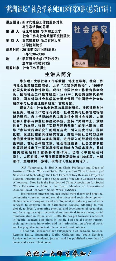 “鹅湖讲坛”社会学系列2018年第9讲(总第17讲)中国社会工作教育协会会长徐永祥教授