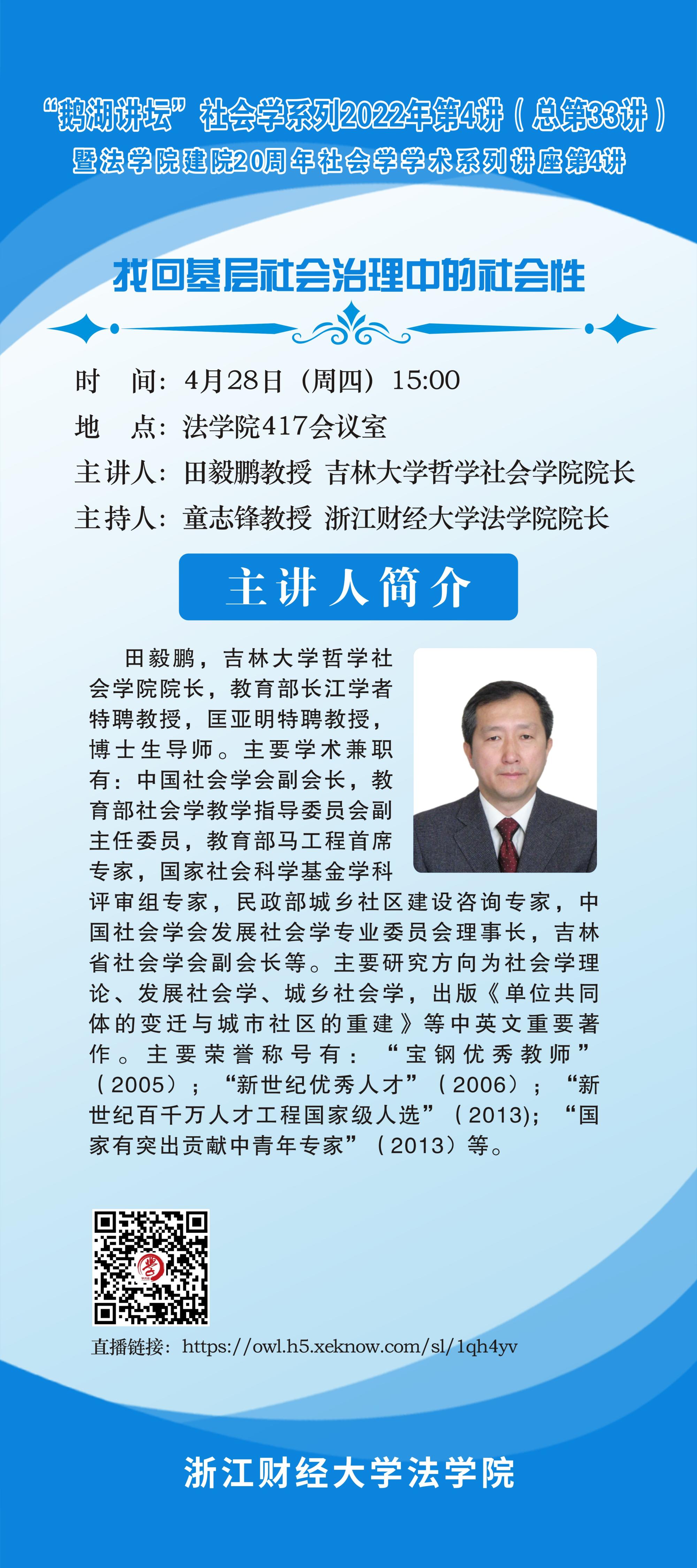“鹅湖讲坛”社会学系列2022年第4讲暨雷速体育官网 建院20周年社会学学术系列讲座第4讲吉林大学田毅鹏教授