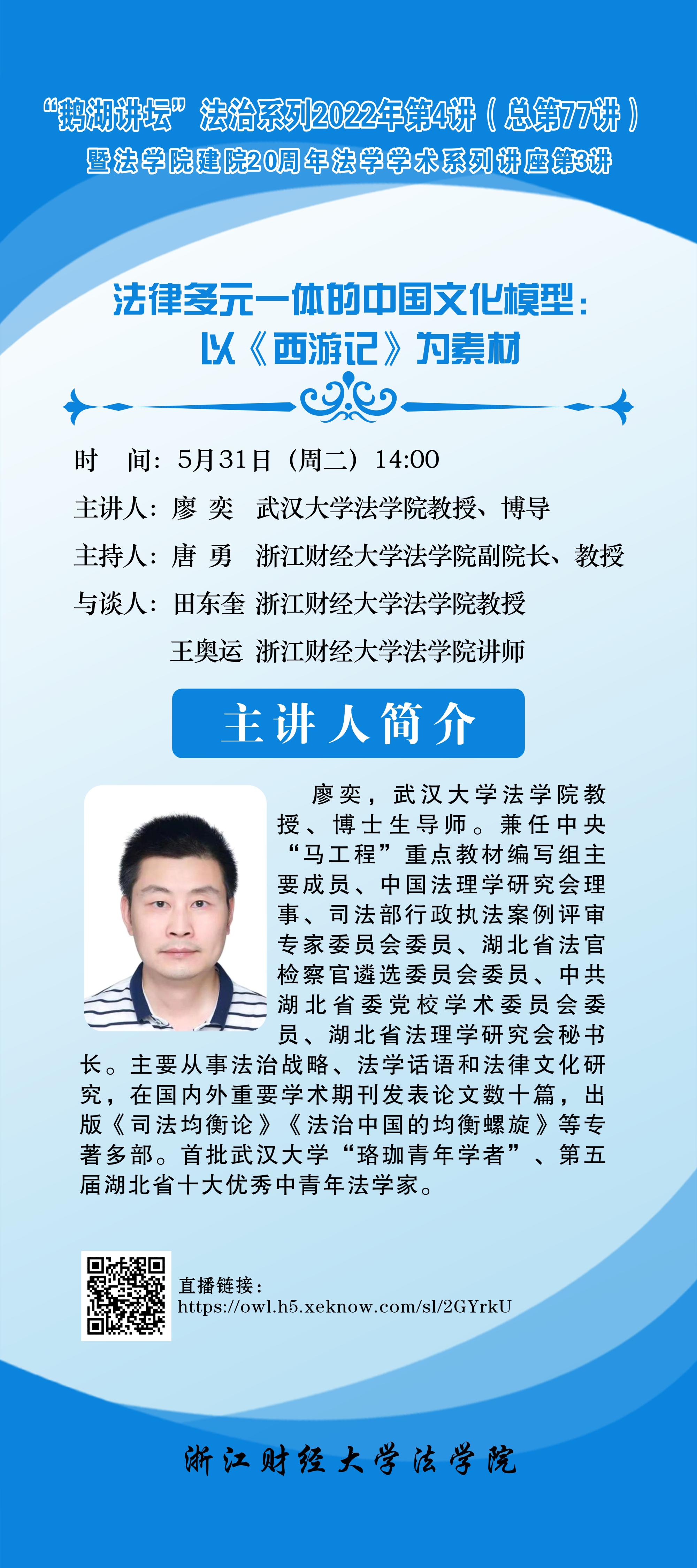 “鹅湖讲坛”法学系列2022年第4讲暨雷速体育官网 建院20周年法学学术系列讲座第3讲武汉大学廖奕教授