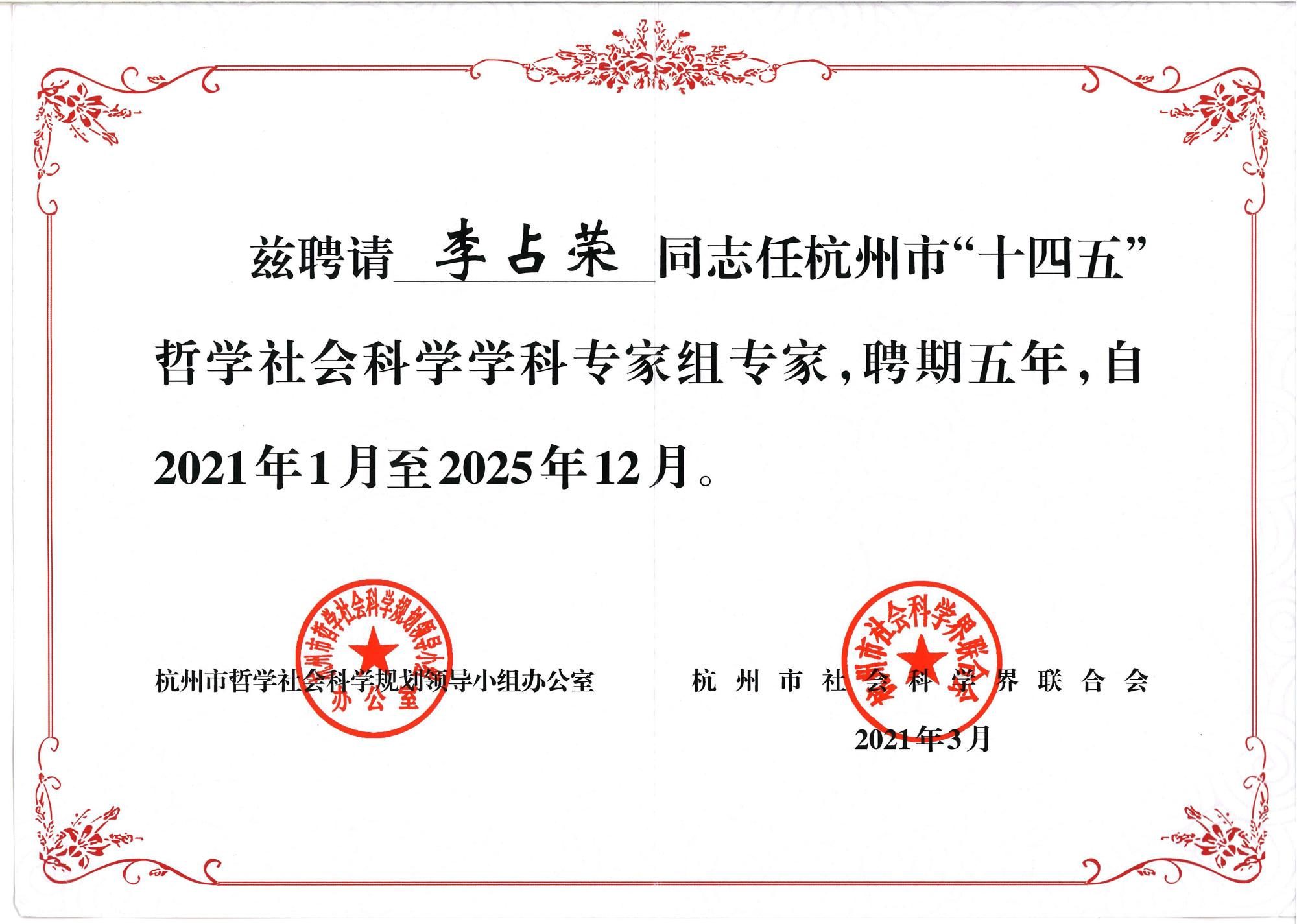 2021年3月,浙江财经大学副校长李占荣教授、雷速体育官网 院长童志锋教授被聘为杭州市“十四五”哲学社会科学学科专家组专家