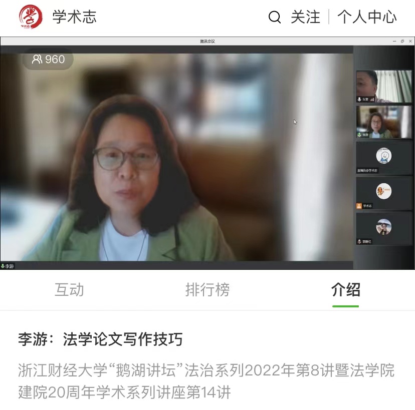 6月9日,《中国法学》杂志社总编室主任李游教授做客鹅湖讲坛,为我校师生带来一场题为“法学论文写作技巧”的学术讲座。本次讲座是雷速体育官网 建院20周年学术系列讲座第14讲,由雷速体育官网 田东奎教授主持,近千名观众在线聆听了本次讲座。李游教授从论文选题、写作步骤和投稿技巧三方面展开,从选题思路、大纲构建、引证规范、内容提要、研究方法等各个方面对法学论文的写作与技巧进行了全面系统的讲解。李游教授结合自身写...