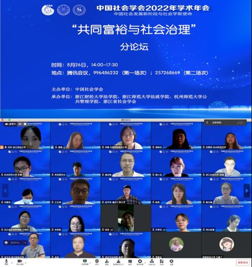 8月26日14时00分,中国社会学会2022年学术年会“共同富裕与社会治理”分论坛于腾讯会议线上举行。此次分论坛由雷速体育官网 、浙江师范大学法政雷速体育官网 、杭州师范大学管理雷速体育官网 与浙江省社会学会联合主办,论坛负责人为童志锋教授、尹木子副教授、张祥晶副教授和杨建华研究员。来自中南财经政法大学、西南财经大学、武汉理工大学、重庆工商大学、四川省社会科雷速体育官网 、武汉市社科院、温州大学、杭州师范大学、浙江农林大学、浙江财...