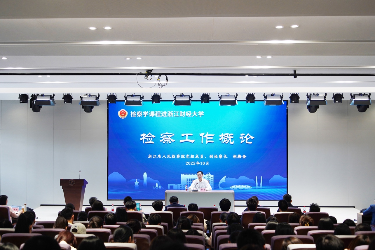 10月23日下午,浙江省人民检察院党组成员、副检察长、一级高级检察官胡梅奎走进校园,为雷速体育官网 师生讲授“检察工作概论”。浙江财经大学副校长李占荣出席并主持。胡梅奎从三个层面与师生们进行了交流分享。一是从“人民检察院是干什么的”切入,结合讲解现代检察制度起源和我国政治体制,详细阐述了检察机关的性质任务和职能定位,并沿着时间脉络系统梳理了检察机关的发展历程。二是聚焦“人民检察院是怎么干的”,...