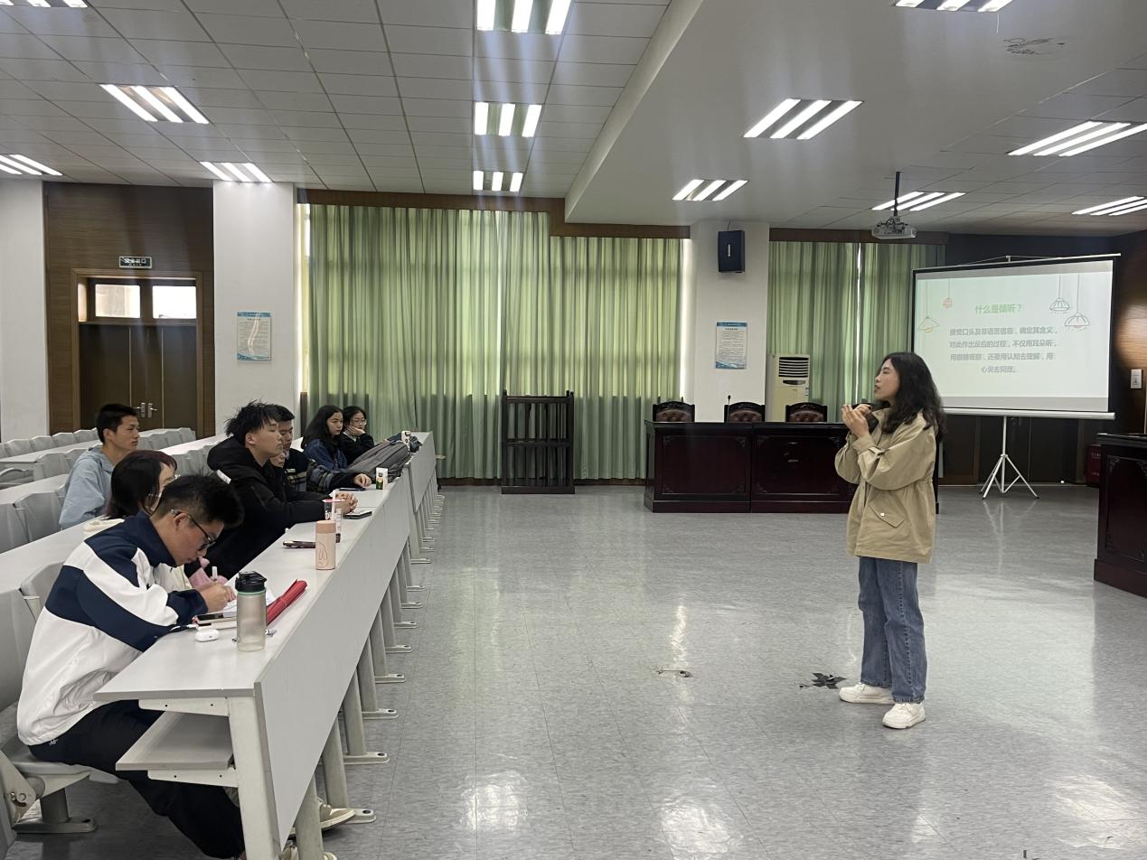 王婷老师首先介绍了本项目的意义和具体内容,同时也对参与项目的乐心同学们提出了具体要求。紧接着,刘芳老师为现场的同学们开展了一场专业的倾听技巧实操培训,随后挑选一名同学上台演练,并对倾听过程中的关键技巧进行了具体指导。