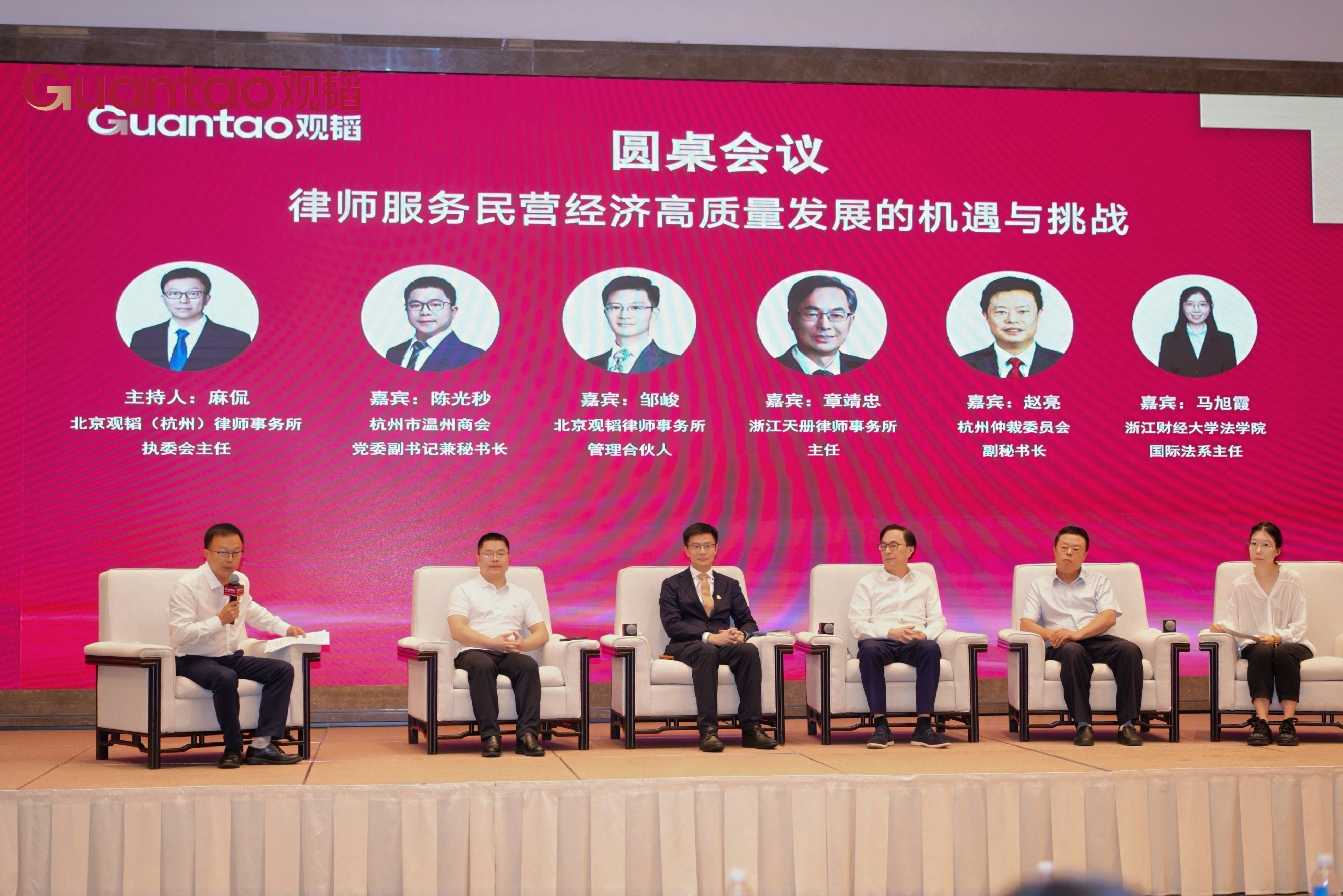 北京观韬(杭州)律师事务所执委会主任麻侃主持第二环节的研讨。浙江天册律师事务所主任章靖忠、杭州仲裁委员会副秘书长赵亮、北京观韬律师事务所管理合伙人邹峻、杭州市温州商会党委副书记兼秘书长陈光秒、国际法系主任马旭霞以圆桌论坛的形式,就相关主题开展深入交流。