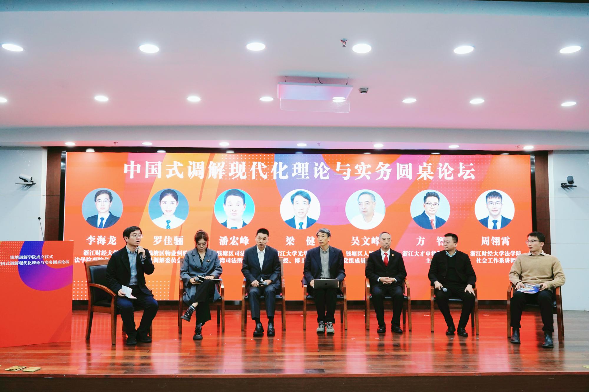 法学院副院长李海龙主持“中国式调解现代化理论与实务”圆桌论坛。浙江大学光华法学院教授、博士生导师梁健、钱塘区人民法院党组成员、副院长吴文峰、钱塘区委政法委(区司法局)新湾司法所所长潘宏峰、浙江大才申律师事务所主任方智、钱塘区物业纠纷人民调解委员会主任罗佳骊、法学院社会工作系博士周翎霄就调解对于社会治理的重要作用、调解员的素养与常见生活纠纷的化解、调解理论的变迁与展望、中外视角下的调解模式分析等话题进行交流探讨。
