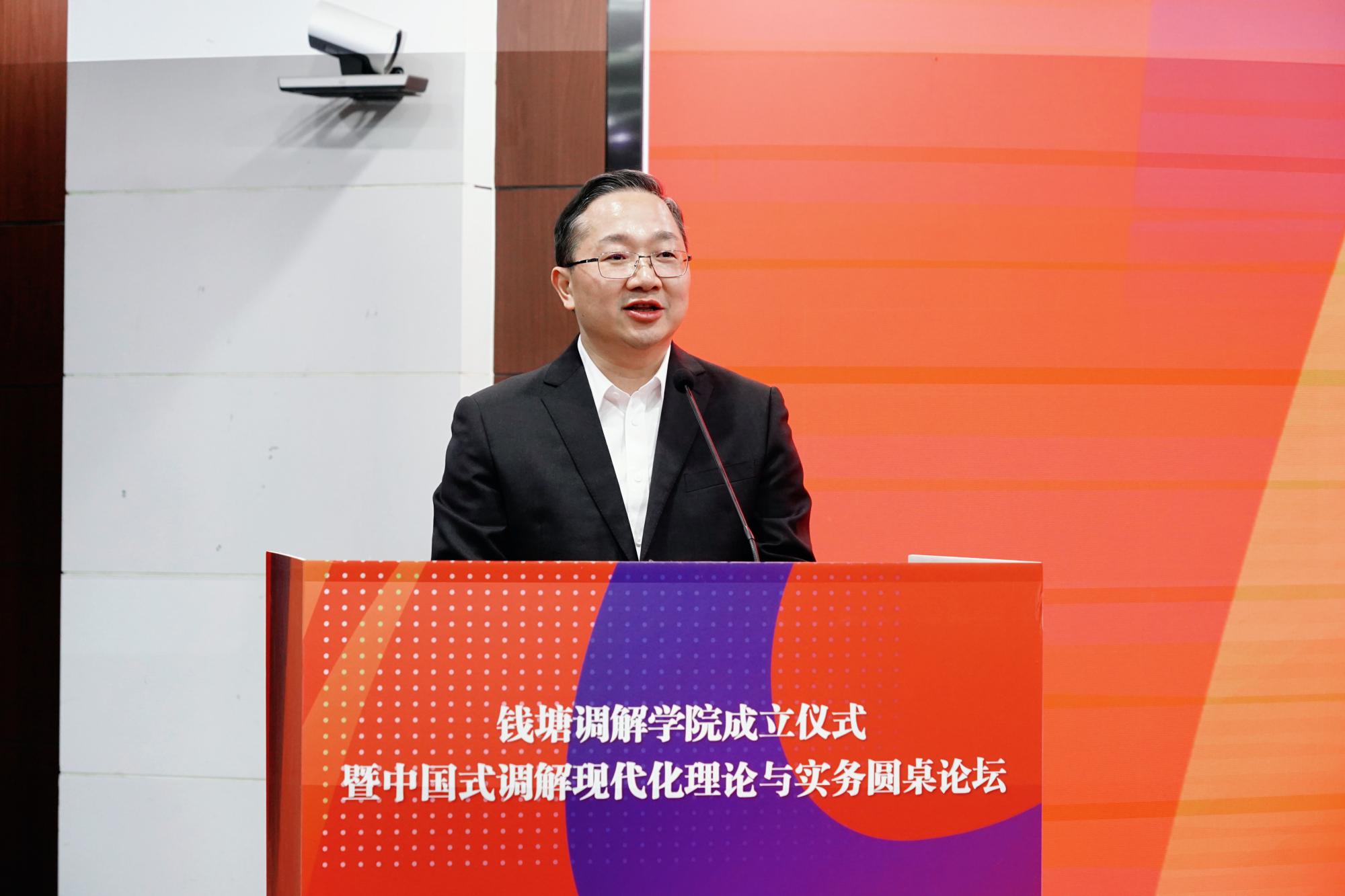 唐学兵代表杭州市中级人民法院对钱塘调解学院的成立表示热烈祝贺。他强调,共建钱塘调解学院是杭州法院和浙江财经大学主动回应时代之问、实践之需的积极作为,是深化基层社会治理创新的一项重要举措,是法治建设与高等教育协同育人的一次生动实践,更是贯彻落实党的二十大关于“完善社会治理体系”决策部署的具体行动。希望共建各方坚持党的全面领导,深度融合高校的学科智力优势、法院的司法实践资源以及社会各界的治理力量,共筑“治理融合体”,在协同联动上彰显新格局;聚焦调解制度完善与理论创新,强化实务技能传授与职业道德培育,共建“人才孵化器”,在育才赋能上实现新突破;突出实战实用导向,通过理论与实践的循环赋能,切实提升矛盾纠纷的实质化解效能,共创“实践先行区”,在提质增效上展现新作为。