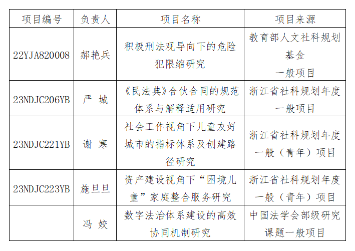 近日,我院多位教师获省部级科研项目立项。郝艳兵副教授获2022年度教育部人文社会科学研究规划基金一般项目立项。严城博士、施旦旦博士、谢寒博士获2023年度浙江省哲学社会科学规划年度一般课题立项。冯姣副教授获中国法学会2022年度部级法学研究课题立项。